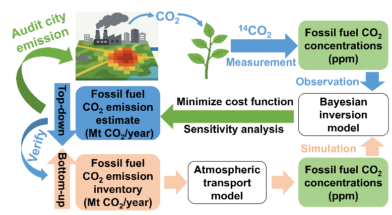 ????14C能夠可靠地量化?CO2ff?與自然生物源排放CO2的相對貢獻。草本植物作為“被動采樣器”,?可在一個生長季內(nèi)整合周到月時間尺度的信號,采樣成本低,適用于高空間分辨率的城市網(wǎng)格化采樣和14C分析。大氣模型反演則能將基于植物14C推導的CO2ff濃度轉化為排放通量與年度排放總量,實現(xiàn)化石源CO2排放清單“自上而下”的獨立校驗和城市碳排放核查。