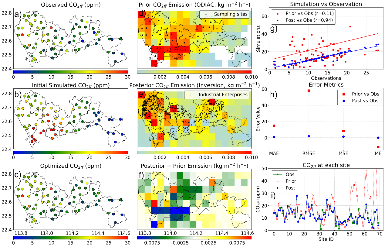 圖3:使用 ODIAC 作為先驗的反演結果。左列展示基于觀測得到的 CO2ff?空間分布 (a)、初始模擬 (b,使用先驗排放) 與優(yōu)化后模擬 (c,使用后驗排放);中列給出先驗排放 (d)、后驗排放 (e) 及二者差值 (f);右列包含模擬值與觀測值的散點對比圖 (g)、誤差指標 (h,MAE、RMSE、MSE、ME),以及各采樣點的 CO2ff?濃度 (i) (MAE:平均絕對誤差,RMSE:均方根誤差,MSE:均方誤差,ME:平均誤差)。