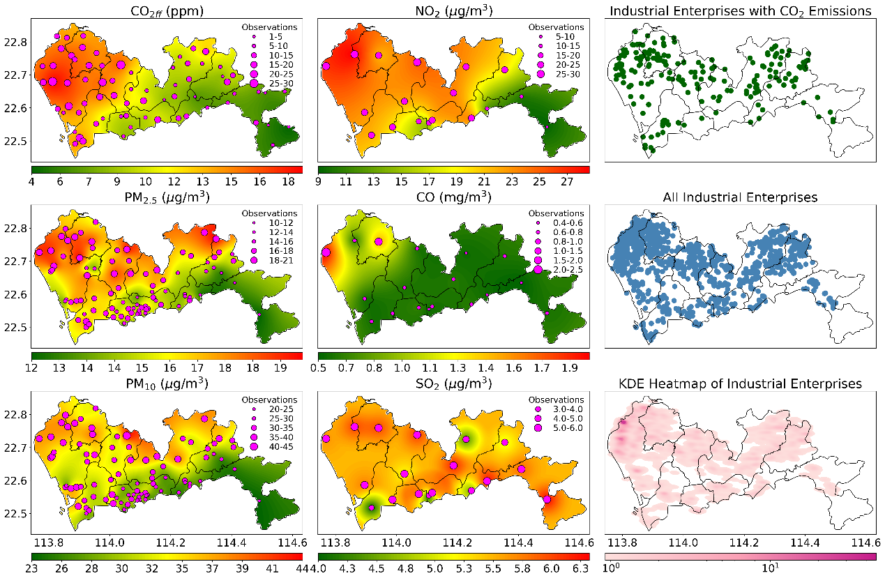 圖4:2022 年深圳市基于 Δ14C 推導的 CO2ff?排放、空氣污染物與工業(yè)企業(yè)的空間分布。左側兩列依次為: (a) CO2ff?濃度(ppm),(b) 細顆粒物 PM2.5(μg m?3),(c) 可吸入顆粒物 PM10(μg m?3),(d) 二氧化氮 NO2(μg m?3),(e) 一氧化碳 CO(mg m?3),(f) 二氧化硫 SO?(μg m?3)。各圖的顏色梯度表示對應污染物的濃度水平,洋紅色圓點為觀測值。右列各圖為: (g) 具有 CO2?排放的工業(yè)企業(yè)分布,(h) 全部工業(yè)企業(yè)分布,(i) 工業(yè)企業(yè)核密度估計(KDE)熱力圖,突出工業(yè)密度較高與潛在排放源區(qū)域。
