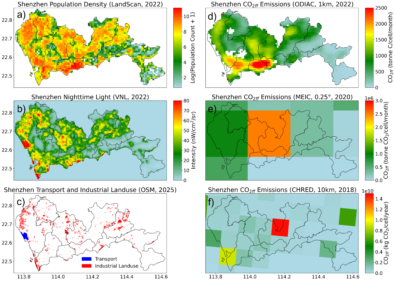 圖5:深圳市多種城市指標與 CO2ff?清單排放的空間分析。圖中展示了關鍵城市要素及不同清單來源的 CO2ff?排放分布:(a) LandScan 2022 的人口密度,采用對數(shù)尺度以突出差異;(b) VNL 2022 的夜間燈光強度,指示城市活動與發(fā)展;(c) OSM 2025 的交通(藍)與工業(yè)(紅)用地;以及基于不同排放清單的 CO2ff?排放估算:(d) ODIAC 2022,(e) MEIC 2020,(f) CHRED 2018。使用不同的顏色刻度表示排放強度。