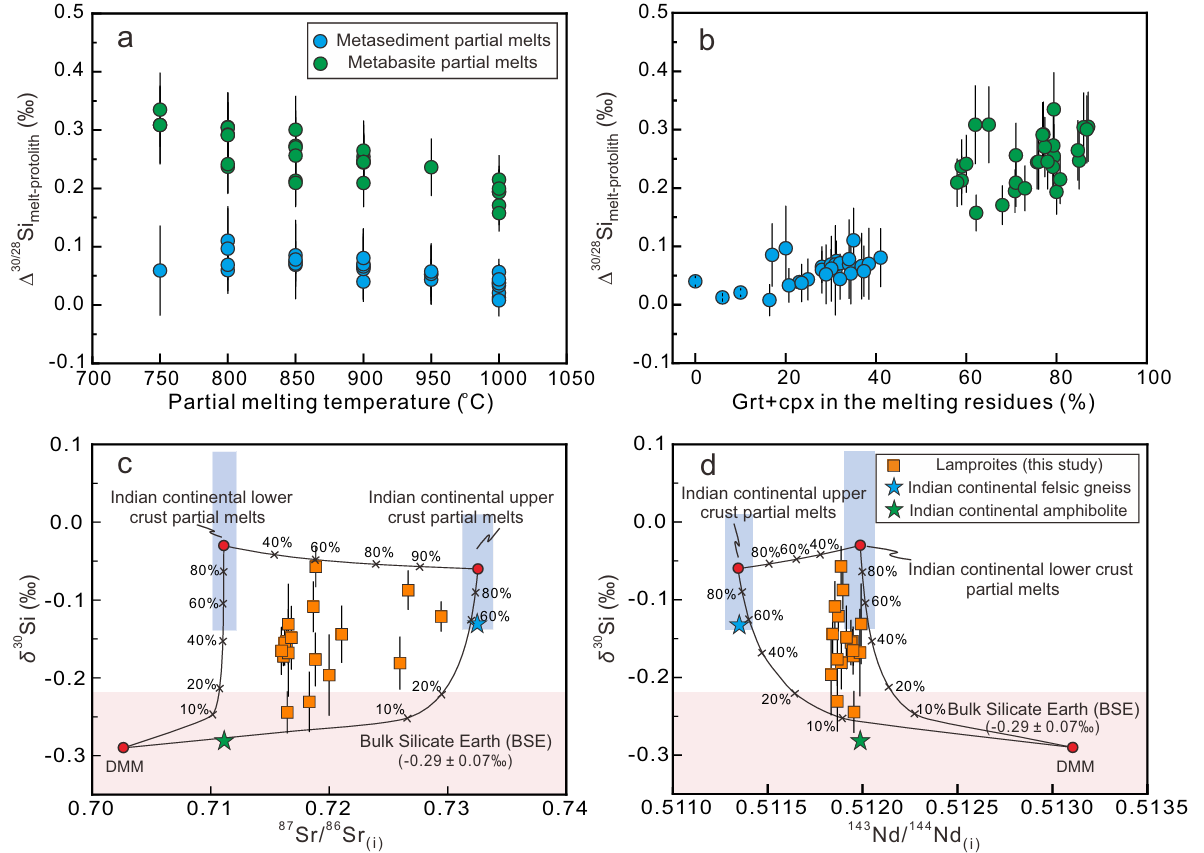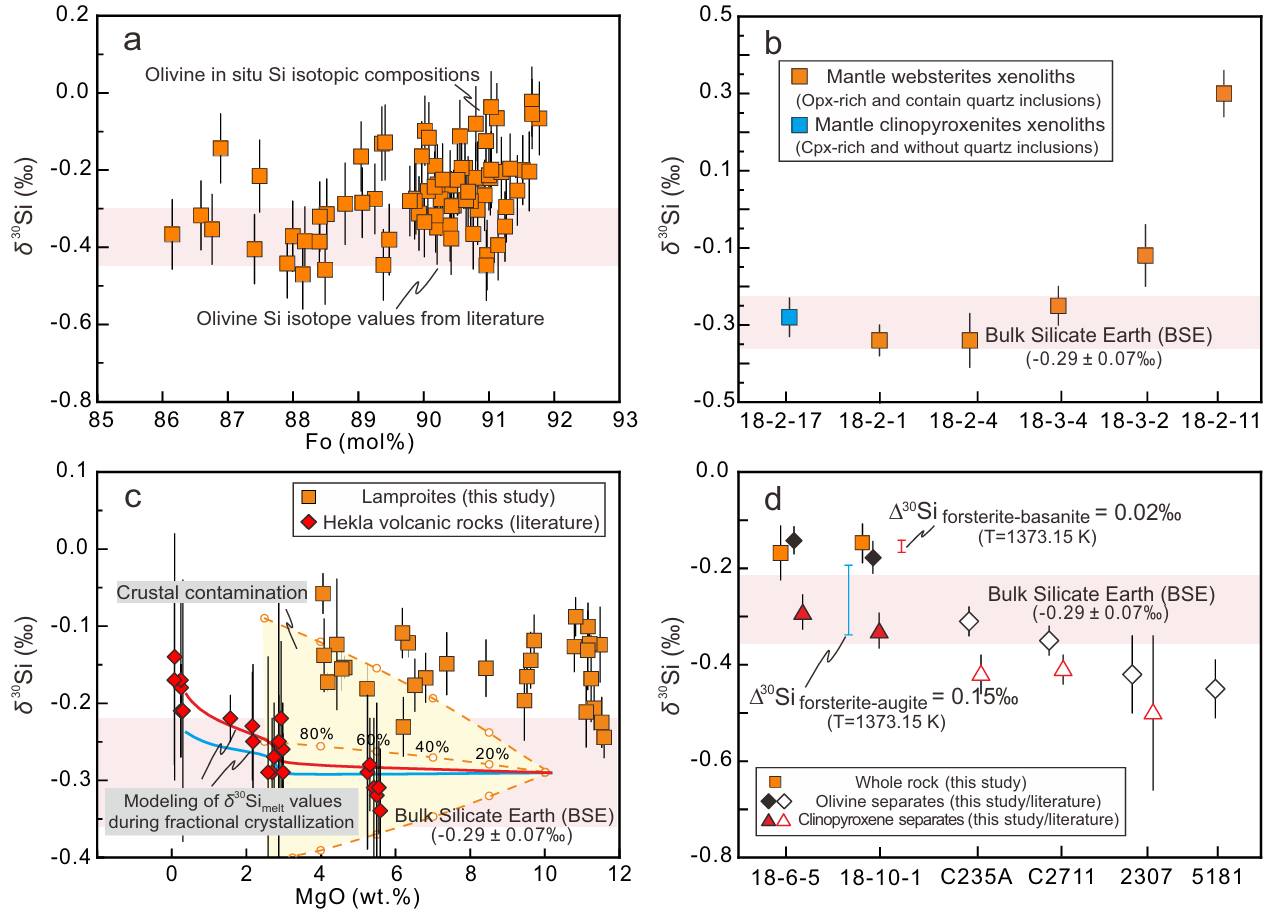 喜馬拉雅-青藏造山帶出露大量新生代幔源超鉀質巖石,這類巖石源于富集地幔的低程度部分熔融,往往反映了地幔源區的不均一性,是研究上述問題的理想對象。研究團隊選擇喜馬拉雅-青藏造山帶碰撞后鉀鎂煌斑巖和伴生地幔輝石巖捕虜體作為研究對象,通過系統的全巖與微區硅同位素分析,取得了以下認識:(1)拉薩地體中新世鉀鎂煌斑巖及其地幔包體的硅同位素值顯著重于BSE,是目前國際上報道的硅同位素最偏重的地幔巖石(圖1);(2)鉀鎂煌斑巖的重硅同位素組成并非由殼內演化過程(例如地表風化、殼內分離結晶及地殼混染)所致,而是直接繼承自其地幔源區(圖2);(3)板片熔融過程會發生顯著的Si同位素分餾,殘留相(如石榴子石+單斜輝石)富集輕硅同位素,而熔體則富集重硅同位素(圖3)。結合前人已發表的資料,重硅同位素儲庫的形成可能與俯沖印度大陸板片熔體引起的地幔交代作用有關。