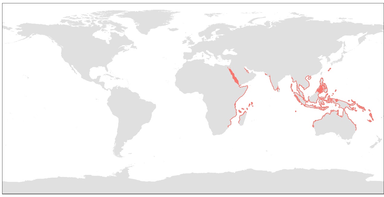 圖1 儒艮地理分布范圍(數(shù)據(jù)來源:國際自然保護(hù)聯(lián)盟瀕危物種紅色名錄)