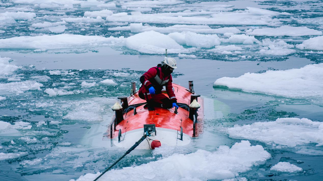 “奮斗者”號在北極密集冰區被起吊出水。圖片來源:“探索三號”船